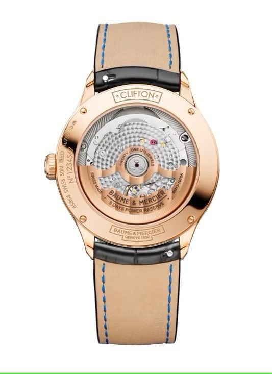 . A mens chronometer watch pairing a warm-white dial with a polished 18K pink gold case, the Clifton Baumatic 10469 expresses modern refinement. This gentlemans watch features a black alligator strap with grey stitching.