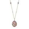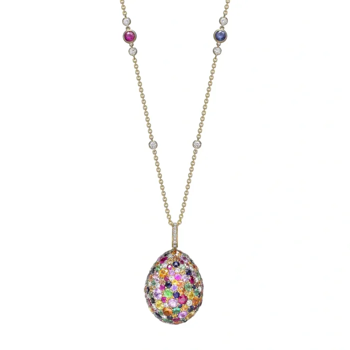 The Emotion Yellow Gold Multicoloured Sapphire, Ruby, Emerald & Tsavorite Egg Pendant comes set in 18 karat yellow gold, with an 18 karat yellow gold gem-set chain. The egg pendant is 26mm.