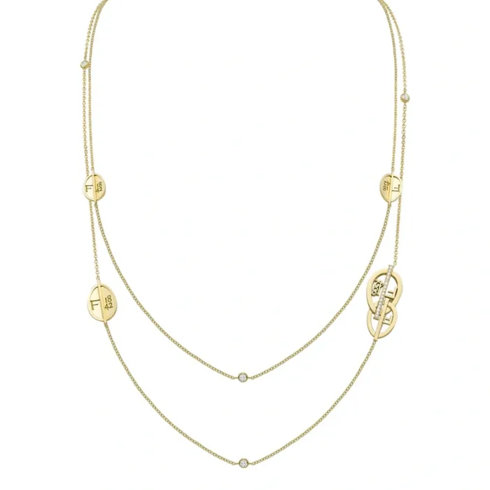 The Faberg? 1842 Yellow Gold & Diamond Egg Sautoir features the Faberg? hallmark and comes set in 18 karat yellow gold with 22 round diamonds featured on a 1.5mm trace chain. The necklace can be worn double looped for a layered effect. The total length of the chain is 100cm.