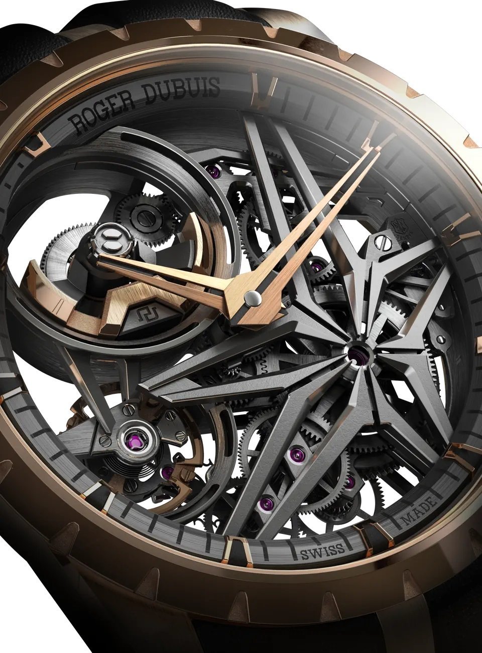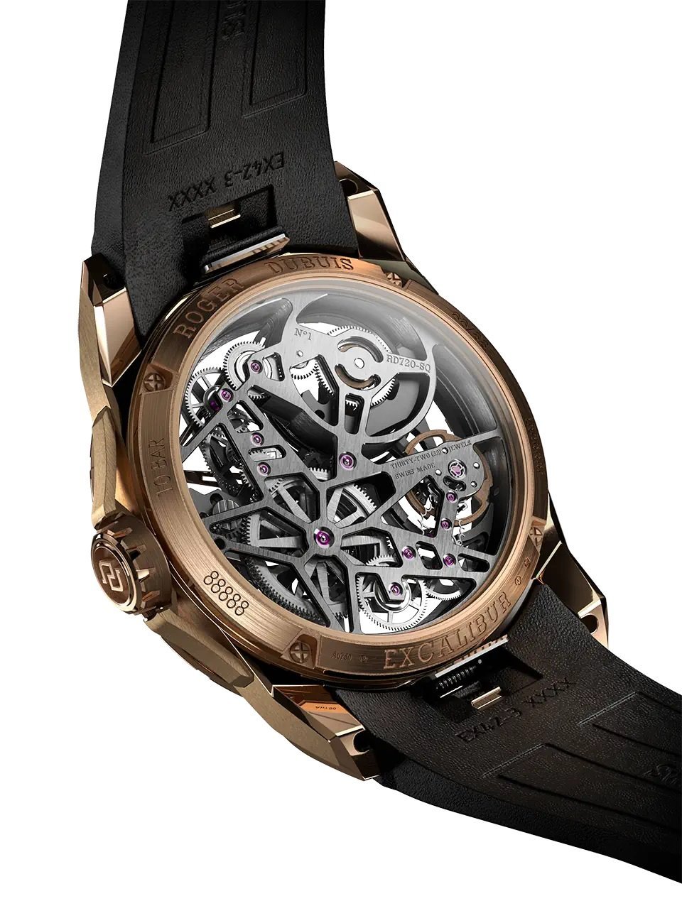 Case. EON GOLD case EON GOLD bezel EON GOLD crown EON GOLD open case back Sapphire crystal with anti-reflective coating. . Size : 42mm. Water Resistance : 10 BAR (100m). Dial. Grey double surface flange with transferred texts and minute track, polished and Pink gold plated hour markers with SLN in the center. . Main material : Eon Gold. . Strap. According our non-exotic policy, Excalibur collection is adorned with a premium calf leather strap, built in volume to follow the design of the case and the movement. The strap is interchangeable thanks to Quick Release System.. . Type : Calf. Color : Black. Interchangeable strap : Yes. Clasp. Pink gold cover with titanium blades, triple folding, interchangeable with Quick Release System QRS. . Type : Pink Gold