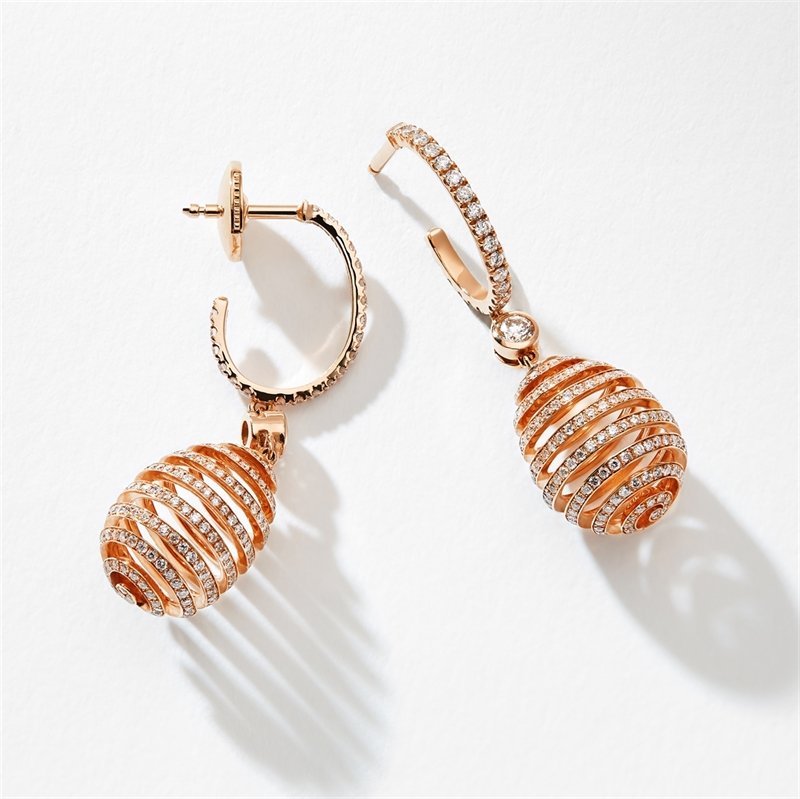 These Spiral Diamond Rose Gold Earrings feature round white diamonds, set in 18 karat rose gold. The egg drops are 14mm.. . The Essence collection celebrates Fabergs love for surprise and wit. Crafted from 18k gold, each piece is inspired by the iconic Imperial Eggs, but incorporates a modern take on the use of diamonds and coloured gemstones.
