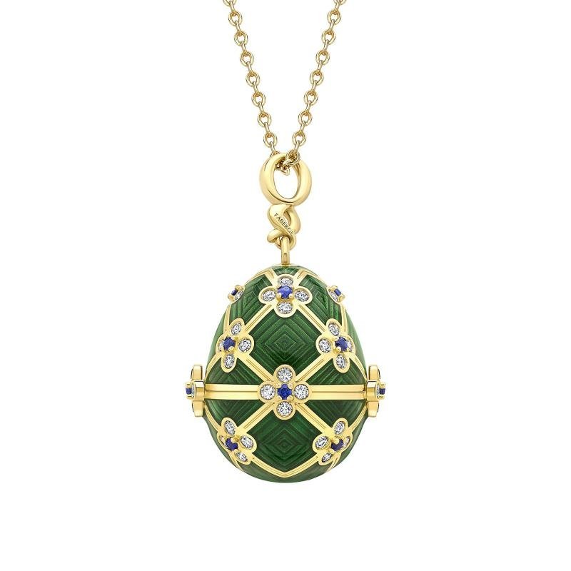 The Faberg x 007 Special Edition Octopussy Egg Surprise Locket has been crafted from 18k yellow gold, and is decorated with green guilloch enamel and set with 60 white diamonds and 15 blue sapphires.. . . . The exterior of the egg closely follows the design of the Faberg egg featured in the film Octopussy, with a beautiful 18k gold lattice framework which is delicately set with blue sapphires and white diamonds in a floral-like design.. . . . The eggs surface features a geometric guilloch engraved pattern, to juxtapose the more organic shape of the egg, and each piece has been decorated with green enamel to perfectly pair with the Faberg x 007 limited Edition Octopussy Egg Objet. Subtle nods to the Octopussy film are also woven into the design, including the bail of the locket which takes its inspiration from the letter O in the films title treatment.. . . . In true Faberg style, the beautiful egg locket also offers a surprise opening to reveal a miniature 18k gold octopus inside, capturing the spirit of the films namesake. The octopus has been set with two black diamond eyes.