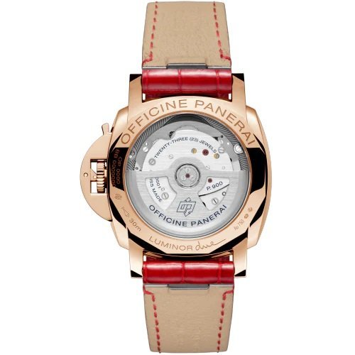 MOVEMENT. Automatic mechanical, P.900 calibre, 12 lignes, 4.2 mm thick, 23 jewels, 28,800 alternations/hour. Incabloc anti-shock device. Power reserve 3 days, one barrel. 171 components. . FUNCTIONS. Hours, minutes, small seconds, date. . CASE. Polished Goldtech 38mm. . BEZEL. Polished Goldtech. . DIAL. White mother of pearl with golden luminous Arabic numerals and hour markers. Date at 3 o'clock and small seconds at 9 o'clock.. . WATER RESISTANCE. "3 bar (~30 metres)". . STRAP. Alligator Shiny Red, Tone on tone Stitching, 20.0/18.0 Standard size