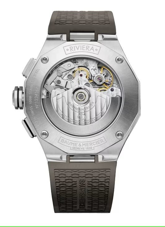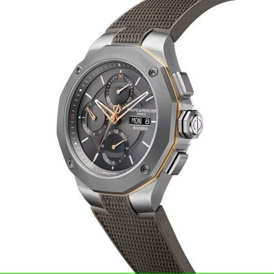 Equipped with a Valjoux automatic movement, this Riviera features a sun satin-finished slate-grey dial and a gray rubber strap with canvas decoration. Featuring a sandblasted titanium bezel enlighted by a PVD gold ring, this timepiece is perfectly in keeping with the Maison’s chronograph tradition.