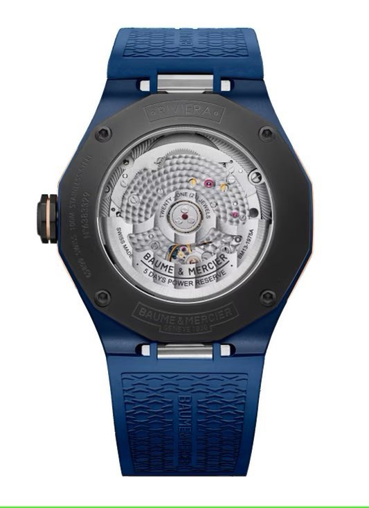 . The Riviera Baumatic 10769 embodies the mineral facet of the Riviera by featuring a steel case paired with a sandblasted titanium bezel. This 42mm timepiece houses a manufacture Baumatic movement ensuring precision and durability, complemented by a sapphire blue dial and a blue interchangeable rubber strap with canvas decor.
