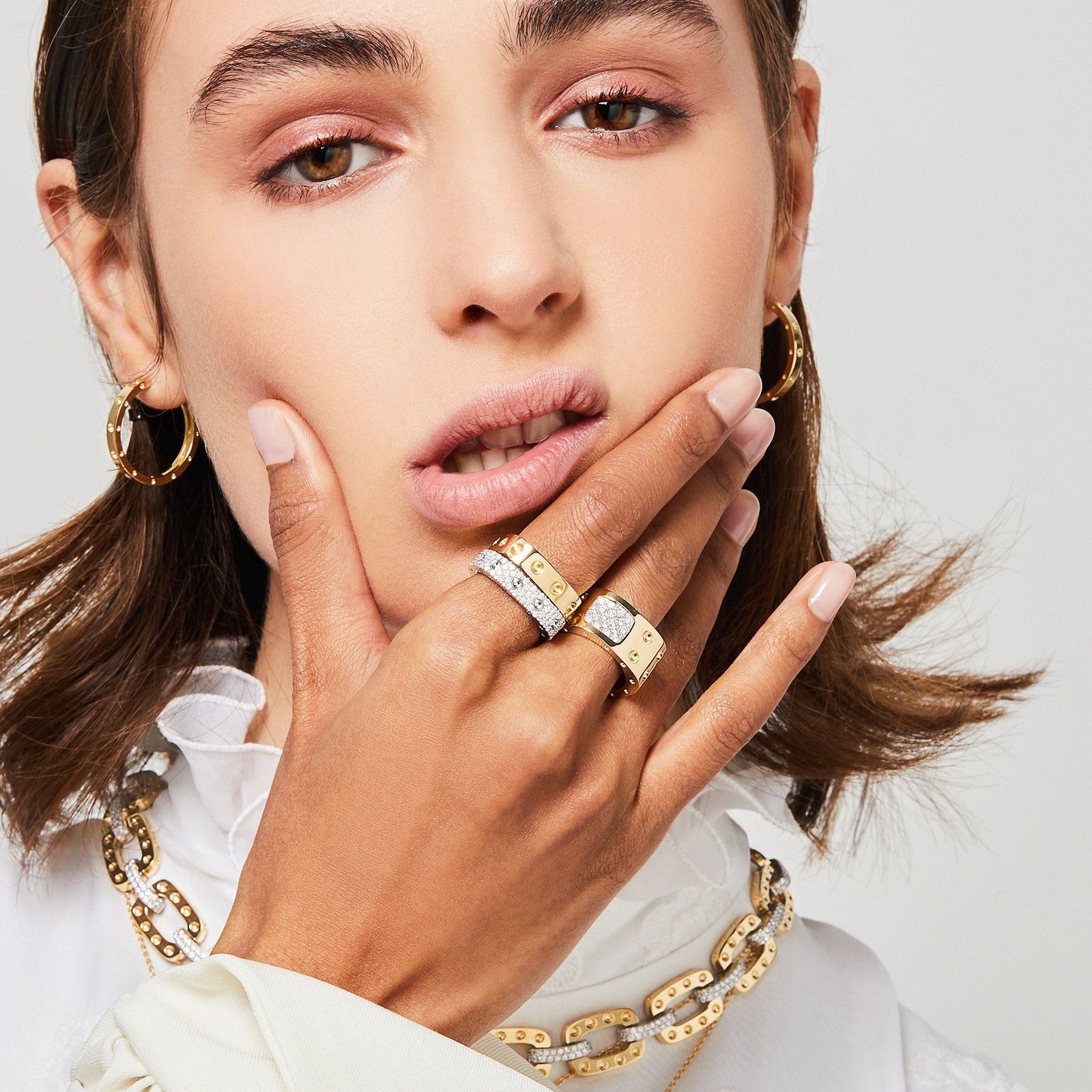 POIS MOI . . The ageless polka-dot trend has relinquished its traditional romanticism in favor of a decidedly edgier, unconventional style that is expressed in three different looks. . . The first version of Pois Moi that came out in 2013 still has the most radical look. The metal is treated like a quilted fabric and the rings and bracelets are shaped like the 1960s Brionvega television sets. Just one year later, in 2014 at the Andrea Palladio International Jewelry Awards, the Pois Moi collection won recognition as the best Italian collection in the world. . . On the wave of such an important success, Roberto Coin created the second edition of Pois Moi, the most luxurious. Every piece is covered in a pave of diamonds in a celebration of the opulent style of the divas of the 30s. . In these first two versions, Roberto Coin took a variety of inspirations from the past and re-interpreted them to create a decidedly modern look. . . The inspiration for the latest edition of the collection, created in 2018, came from far, far away. In its third edition, Pois Moi Luna, Roberto Coin has captured the fashion worlds attraction for the retro-futuristic trend. . The charm of vintage combines with an extraterrestrial atmosphere and the pattern of each piece evokes the uneven surface of the moon, recreated with veritable craters of diamonds and golden pathways. . . This latest edition of Pois Moi once again confirms the originality of its style, a style that gives elegance a decidedly extraordinary touch you could even call it celestial.