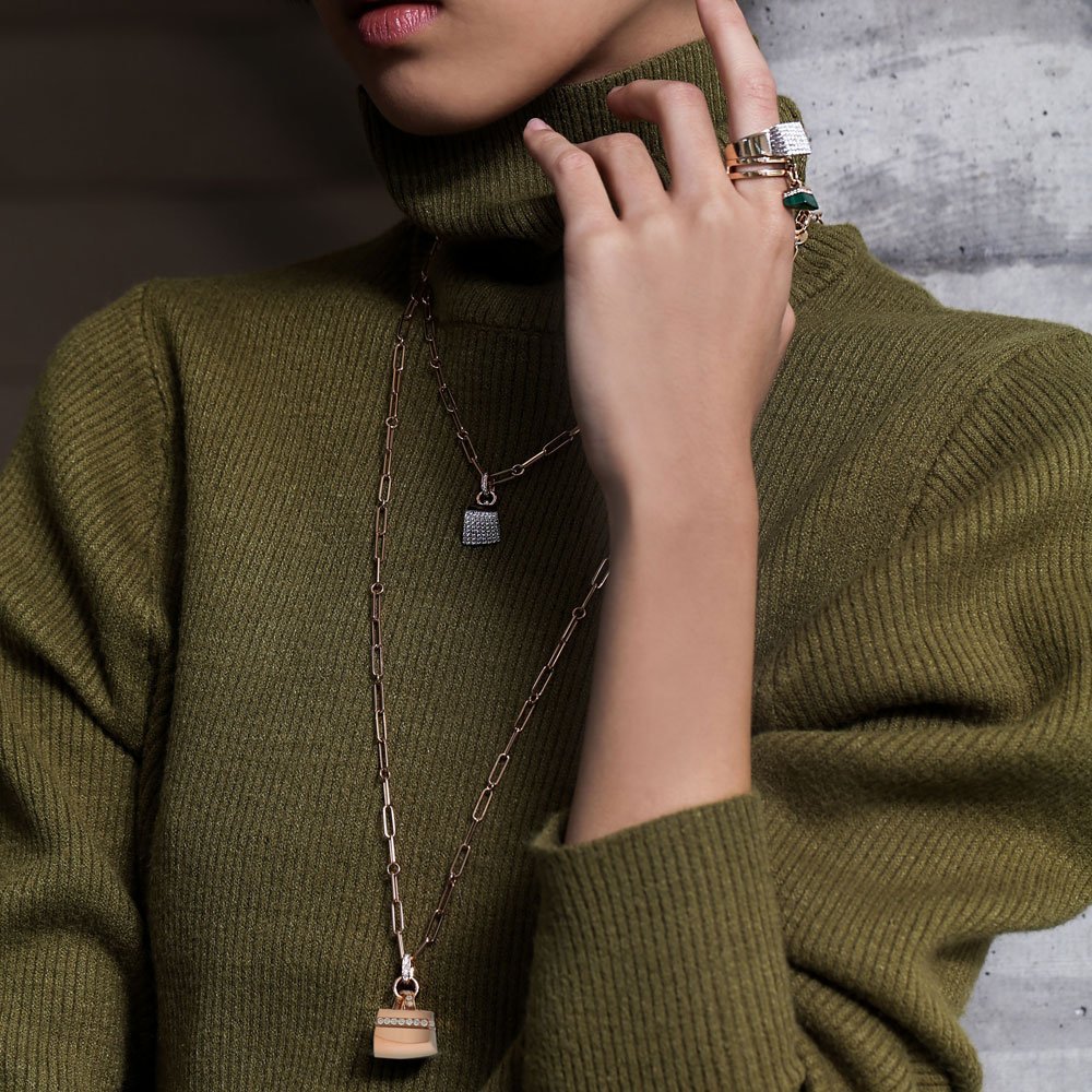 SAUVAGE PRIVE. In the world of fashion, every woman is considered an explorer on a quest to discover new rules and styles in elegance. It has nothing to do with vanity. For many women, exploring refinement is a natural instinct; what they choose to wear stems from values that go much deeper than simple appearances and these women choose to be authentic and to wear their freedom, every day. . Roberto Coin chose to leave the rules of classic fine jewelry behind when he created his Sauvage Priv collection. Its revolutionary shapes and colors intensify the deeply instinctive, unconventional essence that every woman possesses. With his Sauvage Priv jewels, Roberto Coin celebrates those women that he considers courageous and irresistible. . The designs unrestrained, boldfaced geometry goes far beyond innovation. The same impulse is reflected in the unusual choice of stones used to decorate the collection. Black jade, which is extremely difficult to cut, is the shiny, forceful star of the collection. And the malachite, with its naturally unique design is the perfect advocate for the companys mission: to dedicate an exclusive piece of jewelry to every woman.